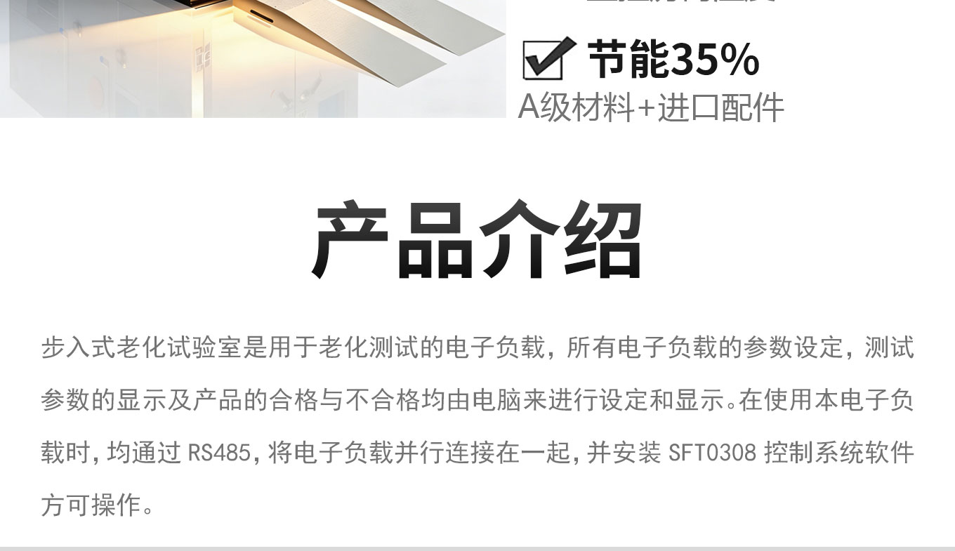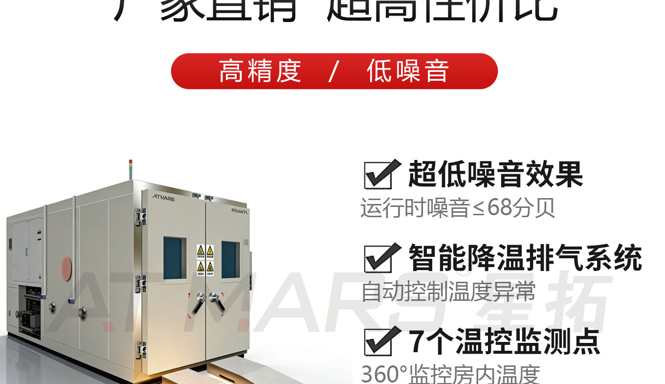 步入式老化试验室又称烧机房,老化房,是提高电工电子等产品稳定性、可靠性的批量老化试验设备。星拓专业定制大型老化房设备,试验房结构可选隔离式、移动式、整体式设计方案,内箱尺寸可定制,温度高达100°C可定制,精度高,温度均匀性好,使用方便安全。