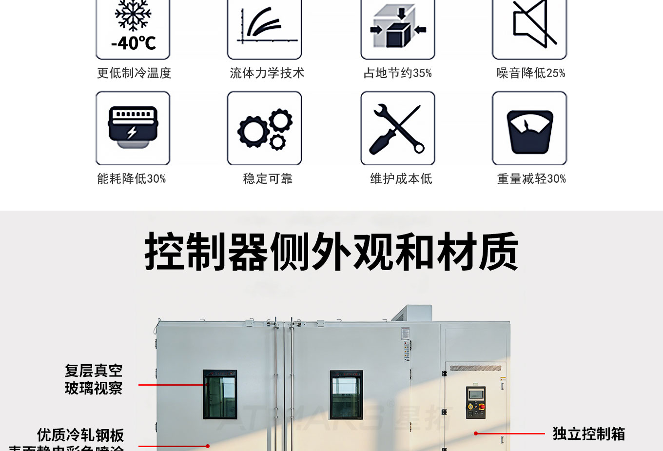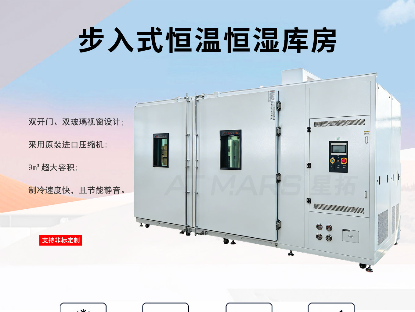 步入式恒温恒湿试验箱,用于模拟高温环境对测试件温度应力测试,温湿度老化测试,性能测试,耐候测试,温度类存储测试等。自主研发高性能控制器:精准控温,功能全面,界面友好。节能降噪:基于流体力学仿真设计优化风道系统,风路循环更合理,灵活可靠的制冷系统设计,兼顾特殊温湿度点和常用实验点,设备运行处于最节能、低噪音状态。