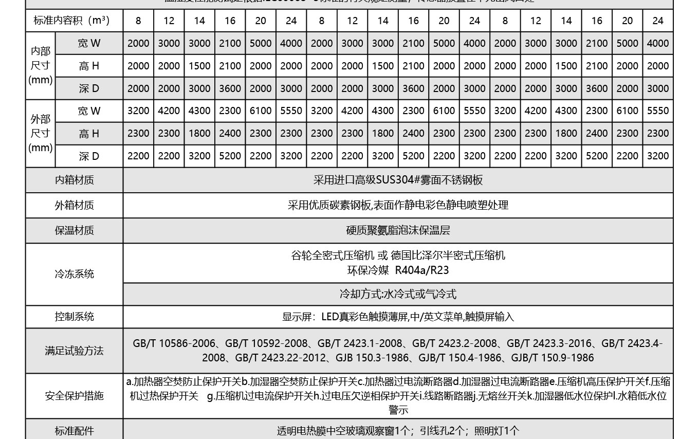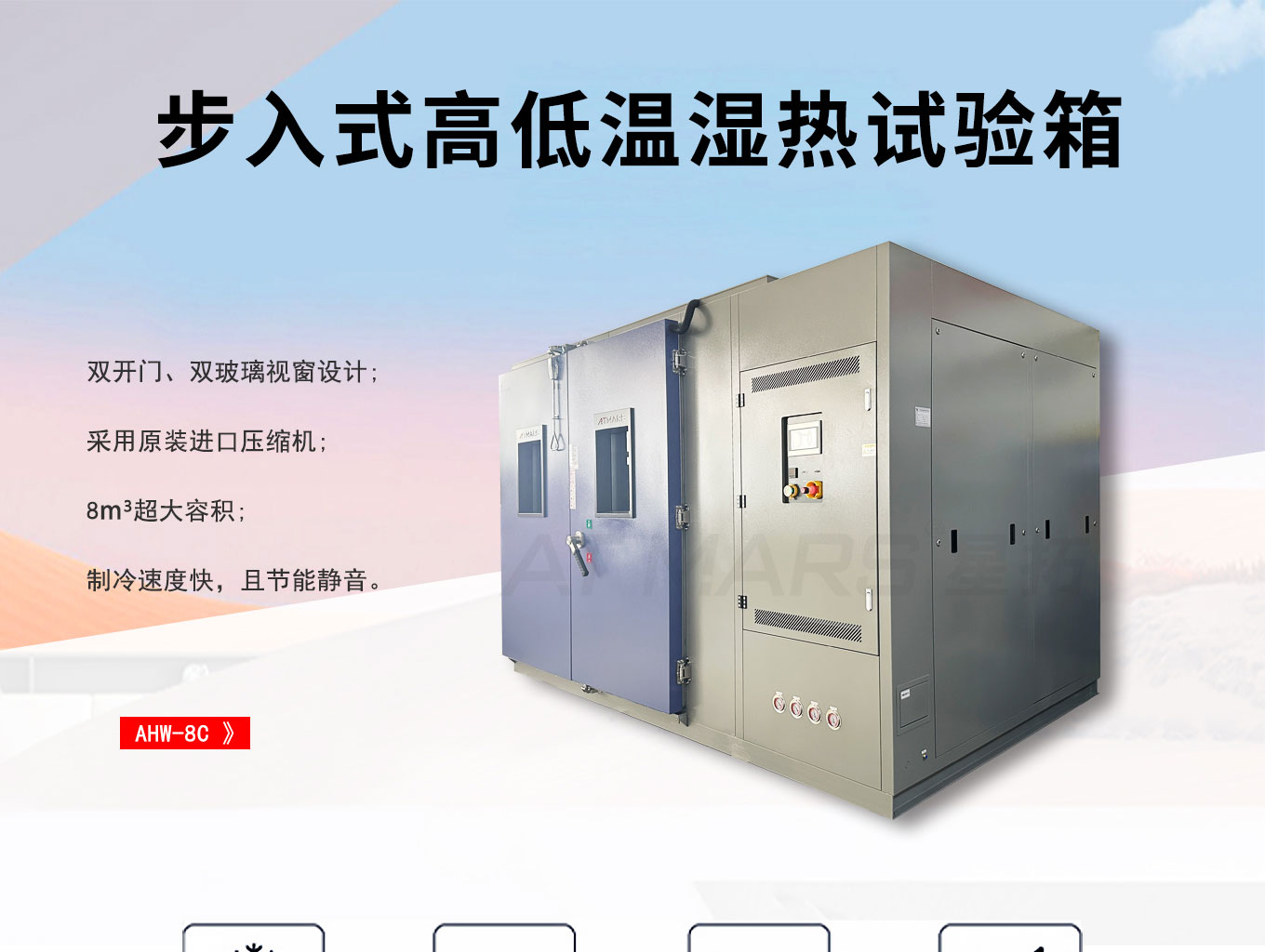 步入式恒温恒湿试验箱专为大型试件高温、低温、恒定湿热及交变湿热试验设计,提供常见内容积为2.5m³、6.6m³、8m³、12.5m³、20m³、25m³、46m³、84m³和300m³的产品以及安装施工方案。广泛应用于航空航天、国防军工、汽车机电、信息通讯、能源材料等行业批量及大件样品环境试验。