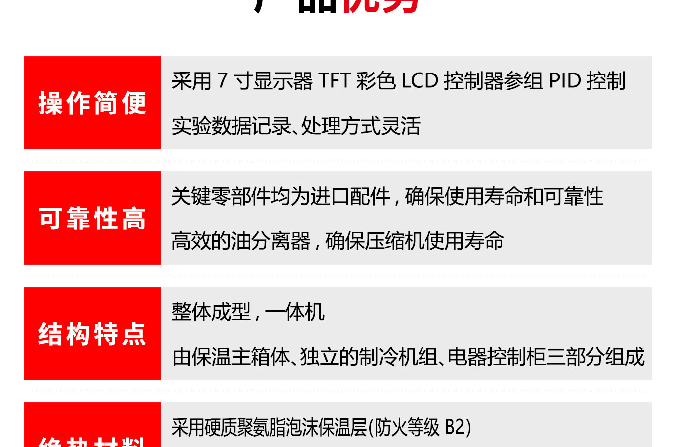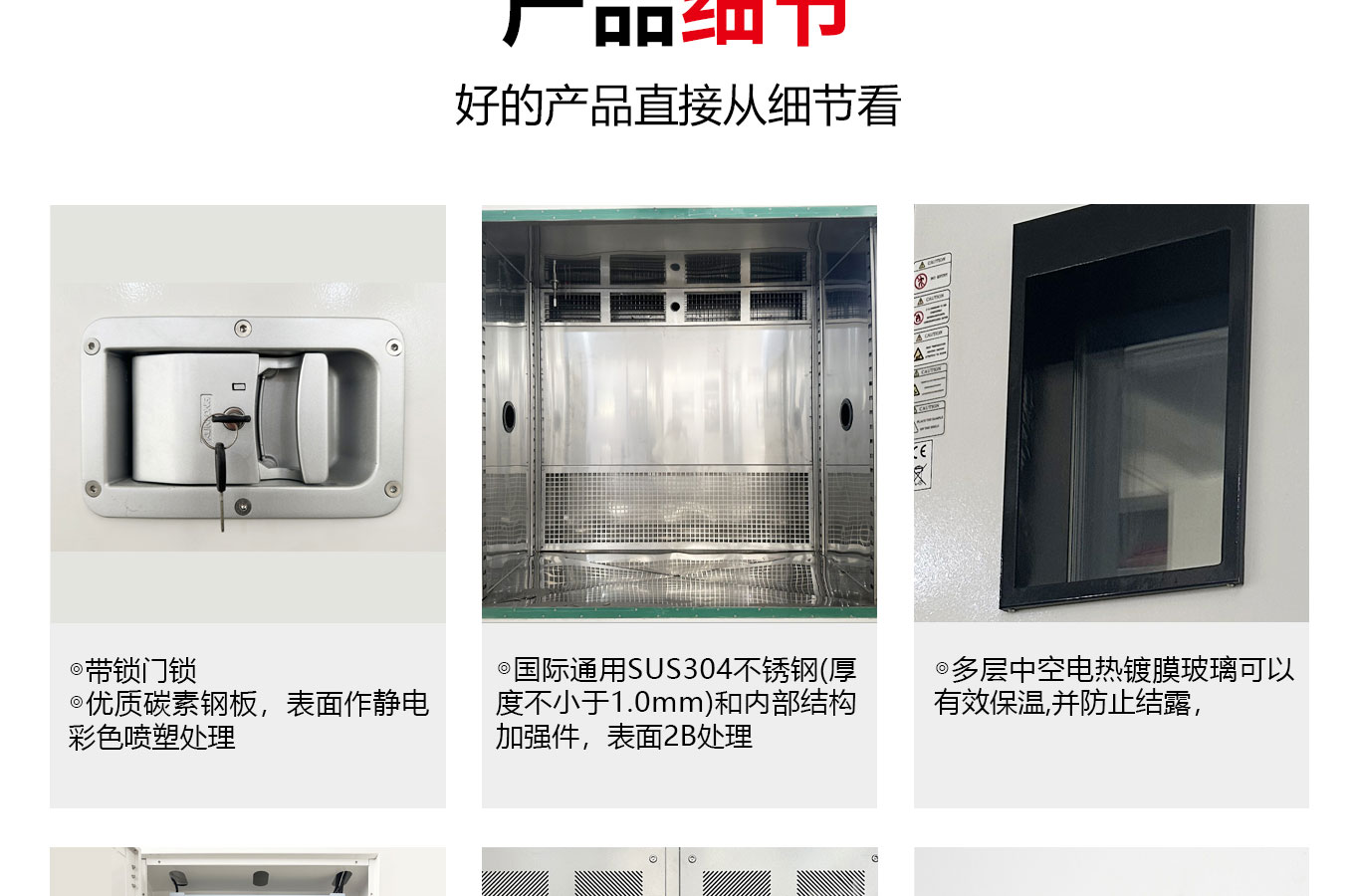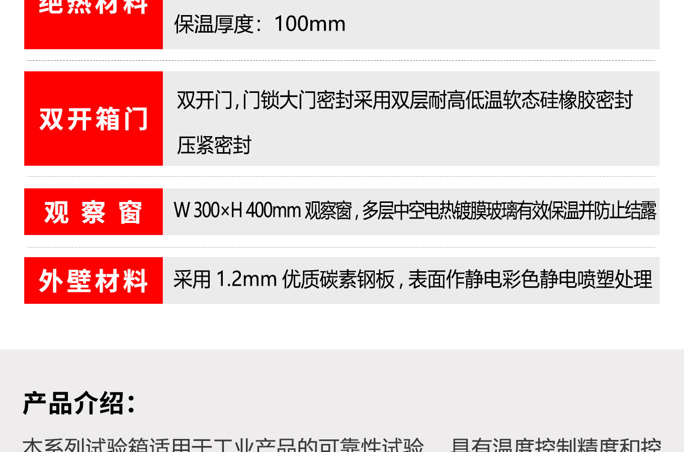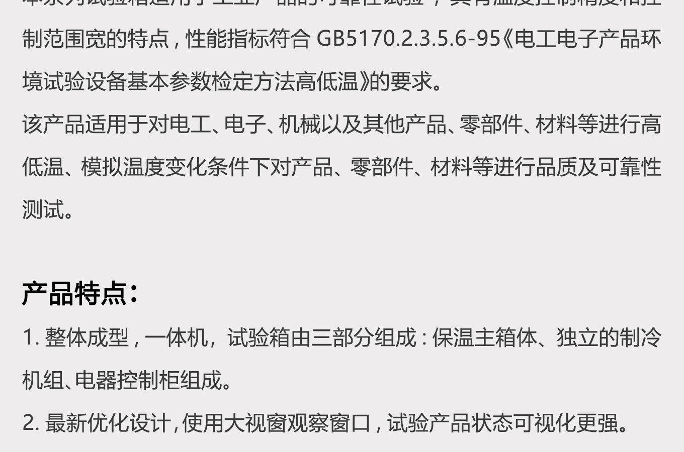 1.整体成型,一体机,试验箱由三部分组成:保温主箱体、独立的制冷机组、电器控制柜组成。 2.最新优化设计,使用大视窗观察窗口,试验产品状态可视化更强。 3.全原装进口硬件,彩色智能触控屏,显示直观,操作简单,运行稳定。 4.可低温连续有效运行1000小时不结霜,高效节能,数据精准。 5.多项安全保护措施,故障报警显示及故障原因和排除方法功能显示。