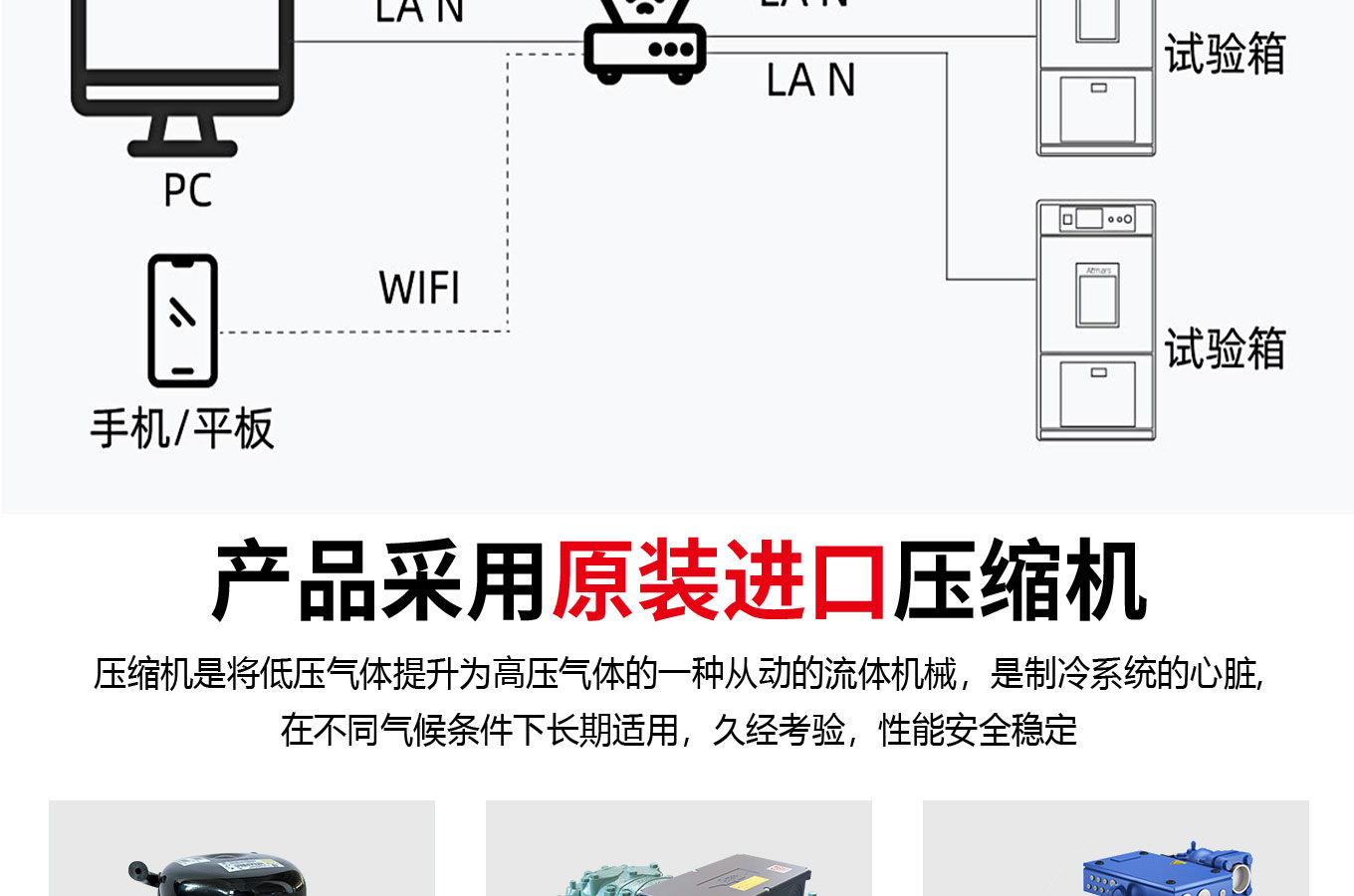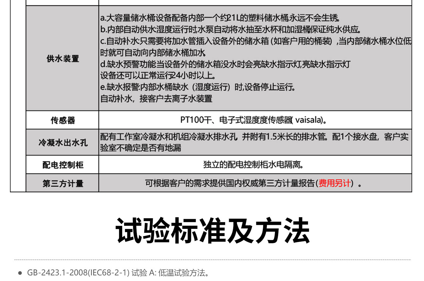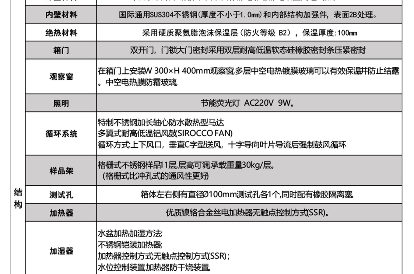 1.整体成型,一体机,试验箱由三部分组成:保温主箱体、独立的制冷机组、电器控制柜组成。 2.最新优化设计,使用大视窗观察窗口,试验产品状态可视化更强。 3.全原装进口硬件,彩色智能触控屏,显示直观,操作简单,运行稳定。 4.可低温连续有效运行1000小时不结霜,高效节能,数据精准。 5.多项安全保护措施,故障报警显示及故障原因和排除方法功能显示。