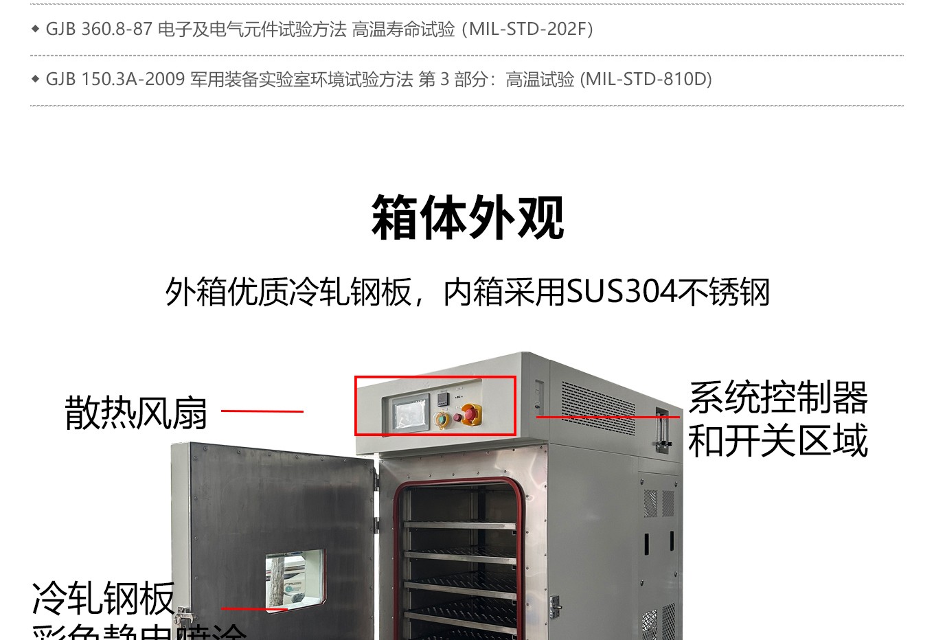 专为大型试件高温、低温、恒定湿热及交变湿热试验设计,提供常见内容积为2.5m³、6.6m³、8m³、12.5m³、20m³、25m³、46m³、84m³和300m³的产品以及安装施工方案(支持非标定制)广泛应用于航空航天、国防军工、汽车机电、信息通讯、新能源整车及配件批量及大件样品环境试验。
